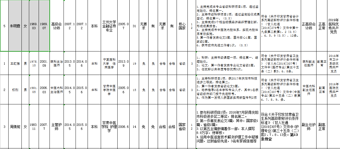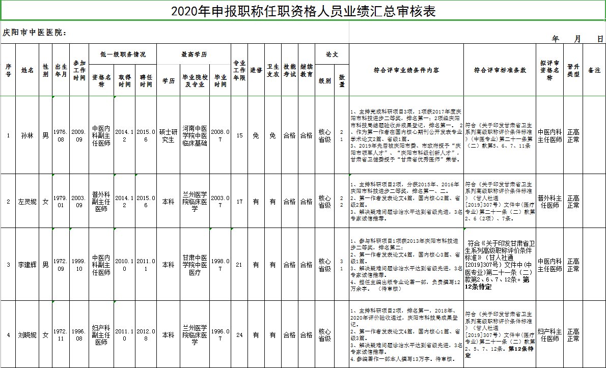 現(xiàn)將申報參加2020年度衛(wèi)生、會計系列高級技術(shù)職務(wù)任職資格評審的孫林等十八名同志有情況予以公示,接受廣大職工監(jiān)督。如發(fā)現(xiàn)有影響推薦的問題,請通過電話、面談等形式反映,我們將及時受理認(rèn)真進(jìn)行核查,并向署名或當(dāng)面反映情況的職工反饋調(diào)查核實情況。如不存在影響其推薦的問題,我們將按程序推薦上報。公示內(nèi)容:《2020年申報高級職稱任職資格評審人員業(yè)績匯總》