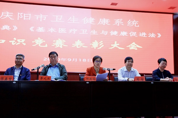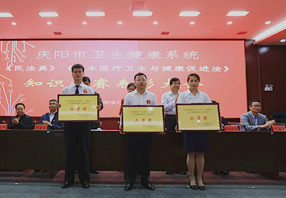 9月18日,市衛(wèi)健委在市第二人民醫(yī)院舉辦了慶陽市衛(wèi)生健康系統(tǒng)《民法典》《基本醫(yī)療衛(wèi)生與健康促進(jìn)法》知識競賽。在副院長張鑫智的帶領(lǐng)下,由公衛(wèi)科彭欣、藥劑科謝萬琳、辦公室陳博組成參賽隊(duì),經(jīng)過激烈角逐,總成績列第二名,榮獲集體二等獎(jiǎng)。謝萬琳獲優(yōu)秀個(gè)人獎(jiǎng)。