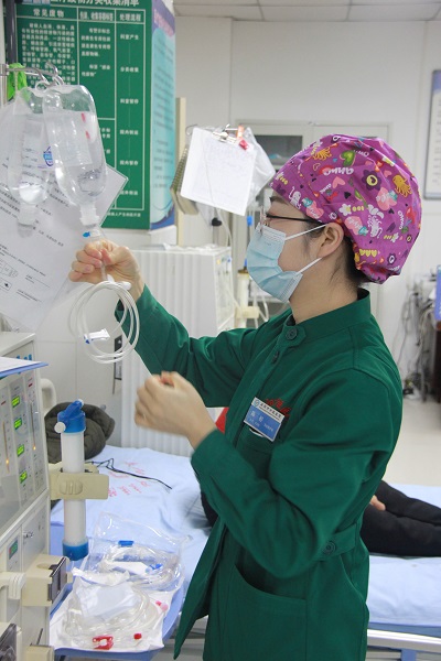開機、預(yù)沖、穿刺、引血、上機、下機、終末處理……透析工作單調(diào)、重復(fù),但是,工作人員日復(fù)一日,年復(fù)一年,每天熱情地接待前來透析的每一位患者。“給予病人溫暖,給予病人第二個家”是我時常掛在嘴邊的一句話。我也將帶領(lǐng)血液凈化中心全體工作人員踐行好這句話,以患者為中心,不斷提升治療水平和服務(wù)質(zhì)量,幫助他們延續(xù)生命、提高生活質(zhì)量,健康回歸社會。