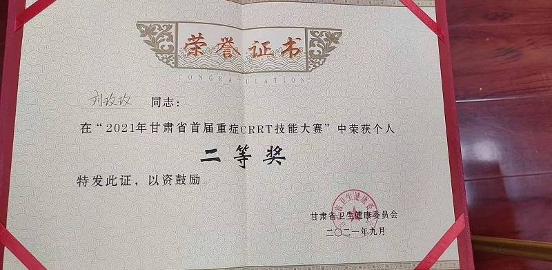 9月17日,我院重癥醫(yī)學(xué)科護(hù)師劉玫玫在甘肅省首屆“重癥CRRT技能大賽”中榮獲個人二等獎,劉玫玫所在的慶陽代表隊榮獲團(tuán)體二等獎。