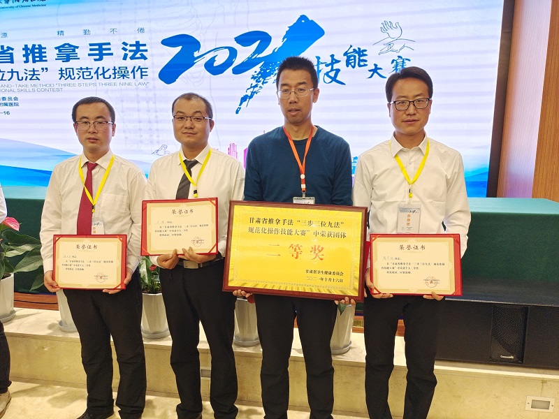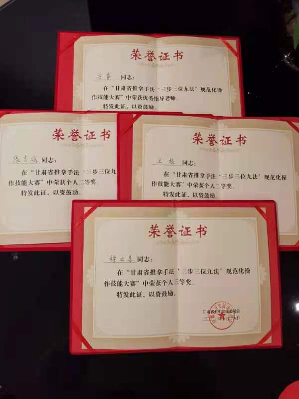 在10月15日至16日舉辦的“甘肅省推拿手法‘三步三位九法’規(guī)范化操作技能大賽”,我院喜獲團(tuán)體二等獎(jiǎng),張吉斌、王振獲個(gè)人二等獎(jiǎng),穆歡喜獲個(gè)人三等獎(jiǎng),賽前給予團(tuán)隊(duì)精心指導(dǎo)的安睿獲優(yōu)秀指導(dǎo)老師稱(chēng)號(hào)。