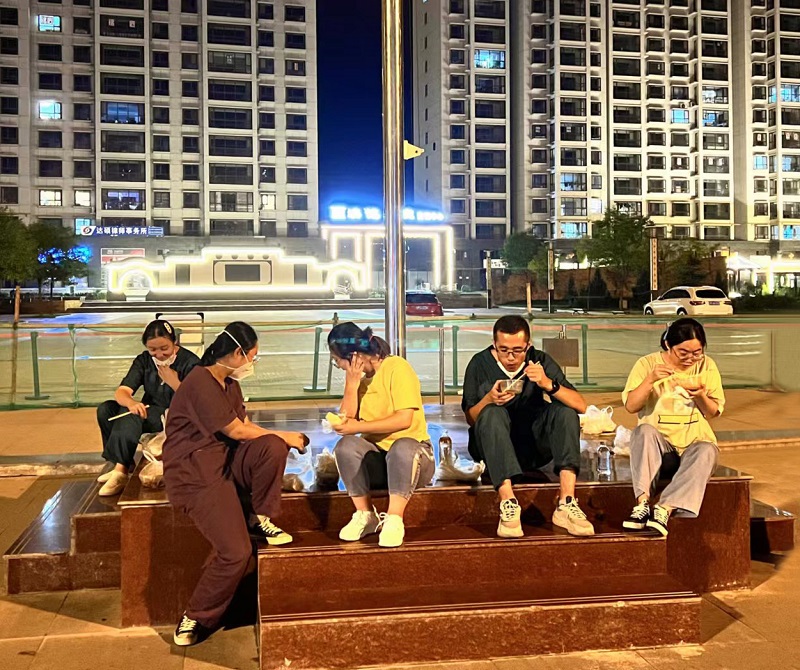 這張名為《“燭光”晚餐》的照片拍攝于去年夏天的鎮(zhèn)原縣西廣場(chǎng),照片中我院檢驗(yàn)科的幾位同志在縣城夜晚的燈光下席地而坐,正大口地吃著盒飯。
