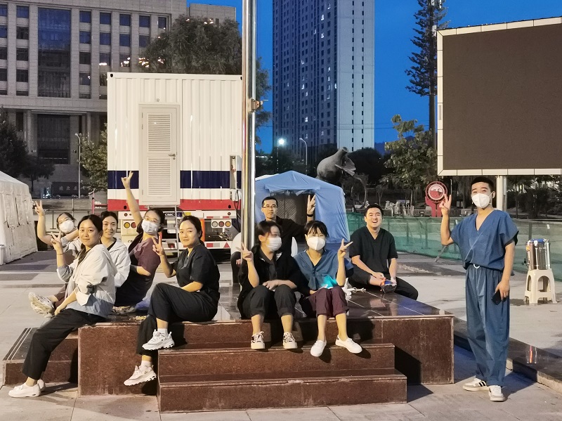 2022年8月底,接到鎮(zhèn)原縣大規(guī)模核酸檢測(cè)任務(wù)后,由我院副院長(zhǎng)開金龍帶隊(duì),同時(shí)抽調(diào)我院移動(dòng)方艙實(shí)驗(yàn)室及11名檢驗(yàn)人員緊急支援。八九月份,正值黃土高原的“秋老虎”天氣,酷熱不減,隊(duì)員們?nèi)投荚诼短鞆V場(chǎng)簡(jiǎn)單對(duì)付,加之方艙制冷系統(tǒng)臨時(shí)故障,幾位隊(duì)員甚至出現(xiàn)暈厥、中暑癥狀,但隊(duì)員們毫不退縮,在短暫休息后仍堅(jiān)持不離崗。支援13天,共檢測(cè)樣本43萬人次,單日最高檢測(cè)量達(dá)9千管。