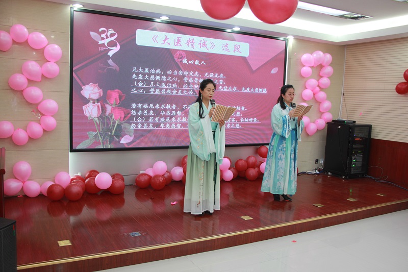 3月7日下午,院領導及各科室70余名女職工代表齊聚一堂,共同誦讀《大醫(yī)精誠》選段,重溫中醫(yī)經(jīng)典,傳承中醫(yī)文化,讓“誠心救人”的行醫(yī)理念深入人心。黨委委員、副院長朱明霞攜女職工代表以一首《醫(yī)院的半邊天》詩朗誦為大家送上了節(jié)日祝福,巾幗風姿颯爽,在鏗鏘有力的朗誦聲中,盡顯女性魅力。