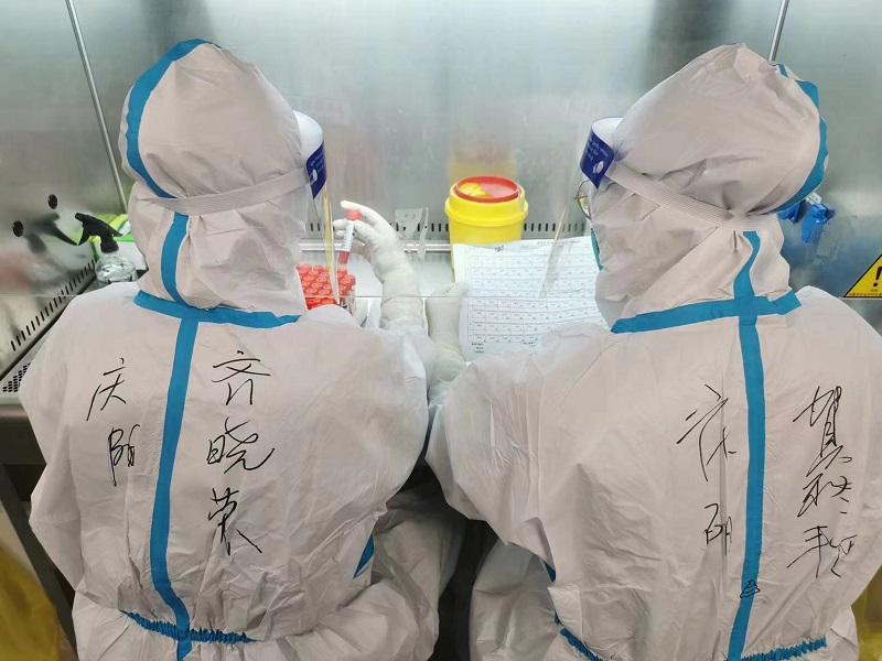 我們醫(yī)院支援了5臺核酸提取儀和12臺核酸擴(kuò)增儀,我主動承擔(dān)起了儀器的調(diào)試與操作工作,并給大家介紹儀器的操作步驟。由于我們核酸檢測隊(duì)伍只有四名男同志,我和其余三名男同志主動承擔(dān)搬運(yùn)儀器、試劑等工作。每個(gè)班次檢測的標(biāo)本量都在一萬管以上,負(fù)責(zé)加樣本的齊曉榮要把每一管標(biāo)本準(zhǔn)確無誤加到一個(gè)個(gè)96孔板里面,每個(gè)班次下來都是腰酸背痛、手指抽筋。